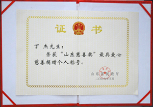 ·2009年,丁杰董事長獲得“山東慈善獎”最具愛心慈善捐贈個人稱號