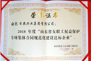 2018年12月,山東省總工會授予日照興業(yè)集團(tuán)“2018年度山東省女職工權(quán)益保護(hù)專項(xiàng)集體合同規(guī)范化建設(shè)達(dá)標(biāo)企業(yè)”